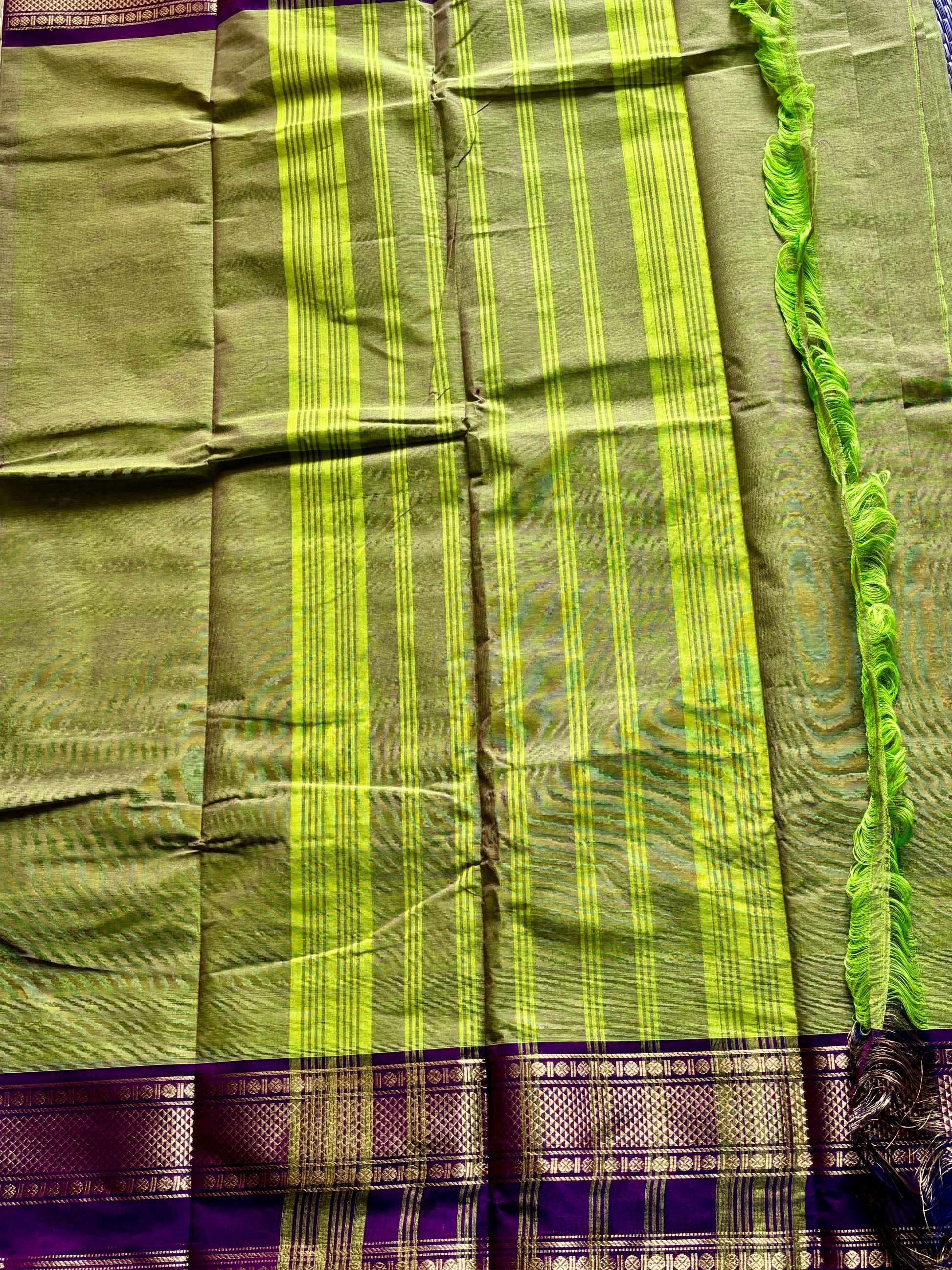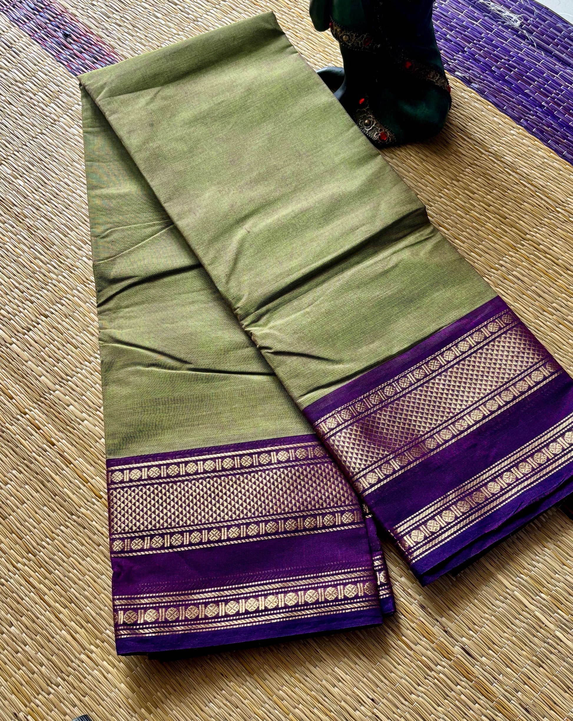 A graceful handwoven saree featuring a classic Dual tone olive green body.The border stands out in a vibrant purple , adding a touch of tradition and elegance. Perfect for temple visits, festive occasions, or a cultural evening, this saree balances simplicity with richness.