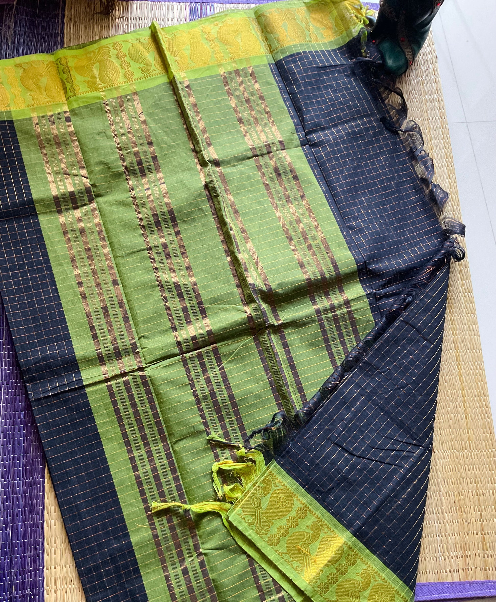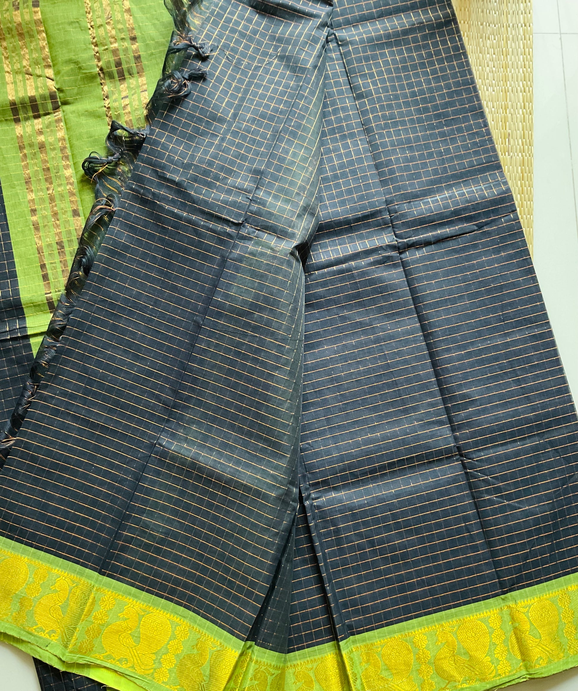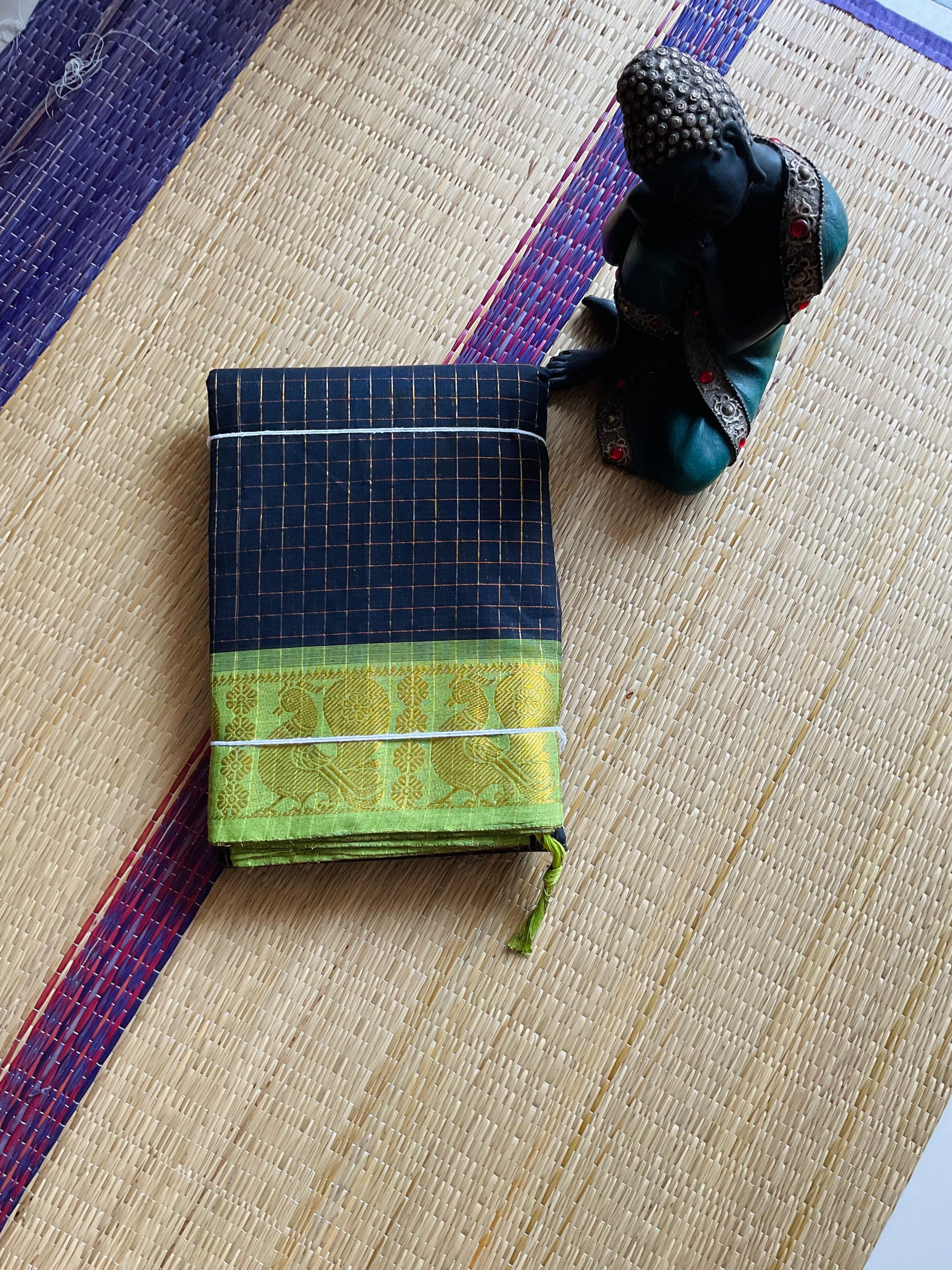 A graceful handwoven saree featuring a classic black body adorned with fine golden checks. The border stands out in a vibrant parrot green, highlighted with intricate golden zari motifs of peacocks and floral patterns, adding a touch of tradition and elegance. Perfect for temple visits, festive occasions, or a cultural evening, this saree balances simplicity with richness.