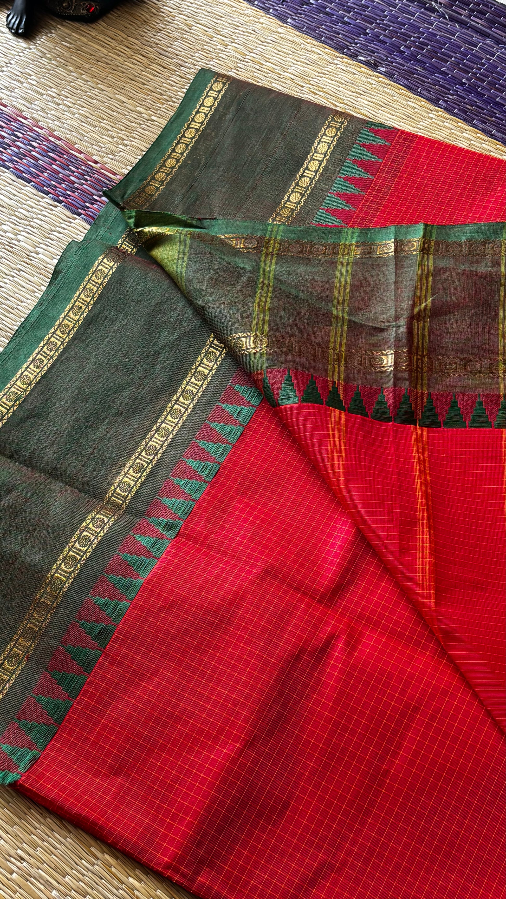 Meet Pallavi, a classic Chettinad Cotton saree woven in rich red with fine checks and adorned with a deep green border highlighted by subtle gold zari. Graceful, breathable, and rooted in tradition — Pallavi brings the charm of everyday elegance with a hint of festive warmth.