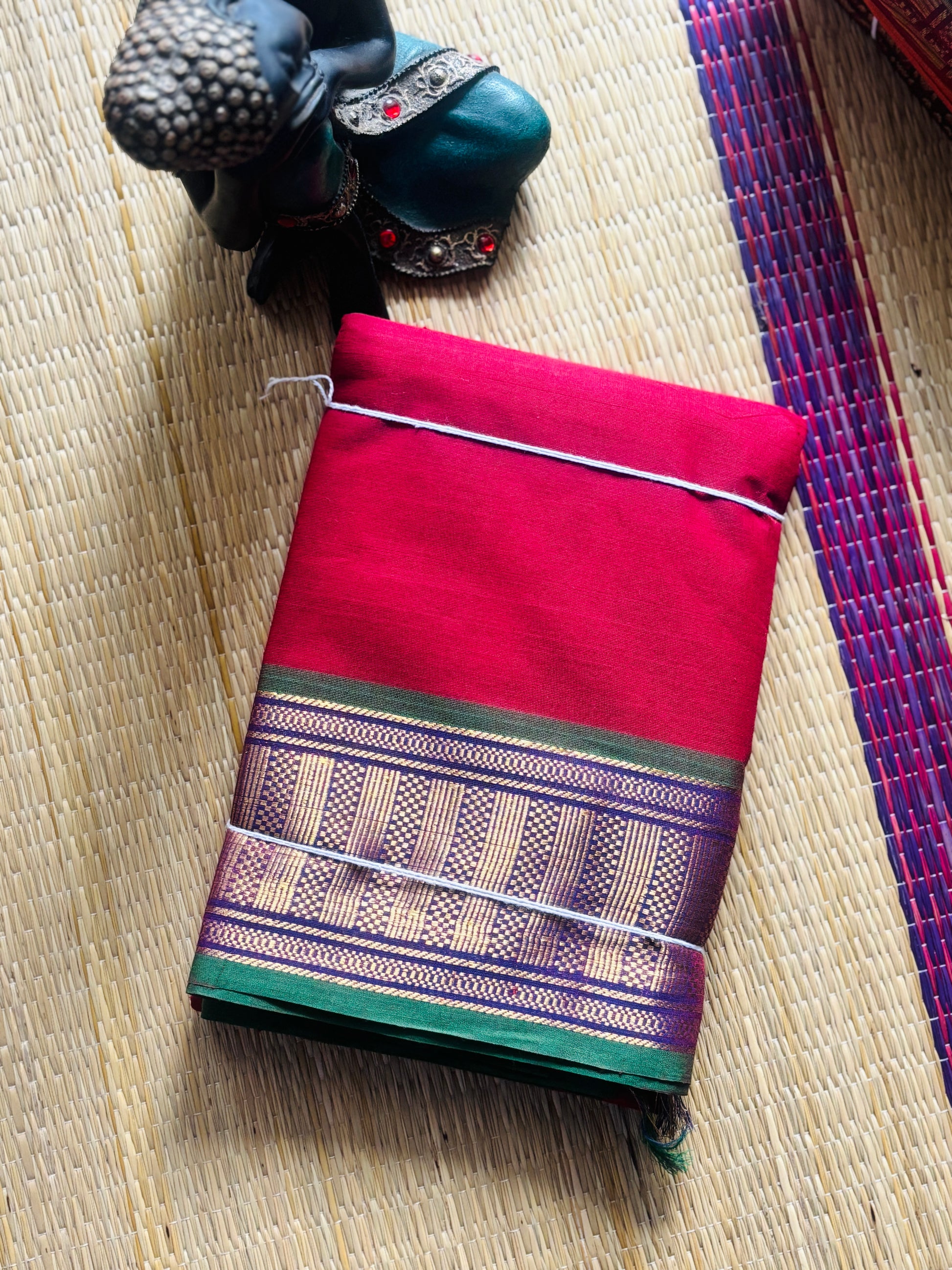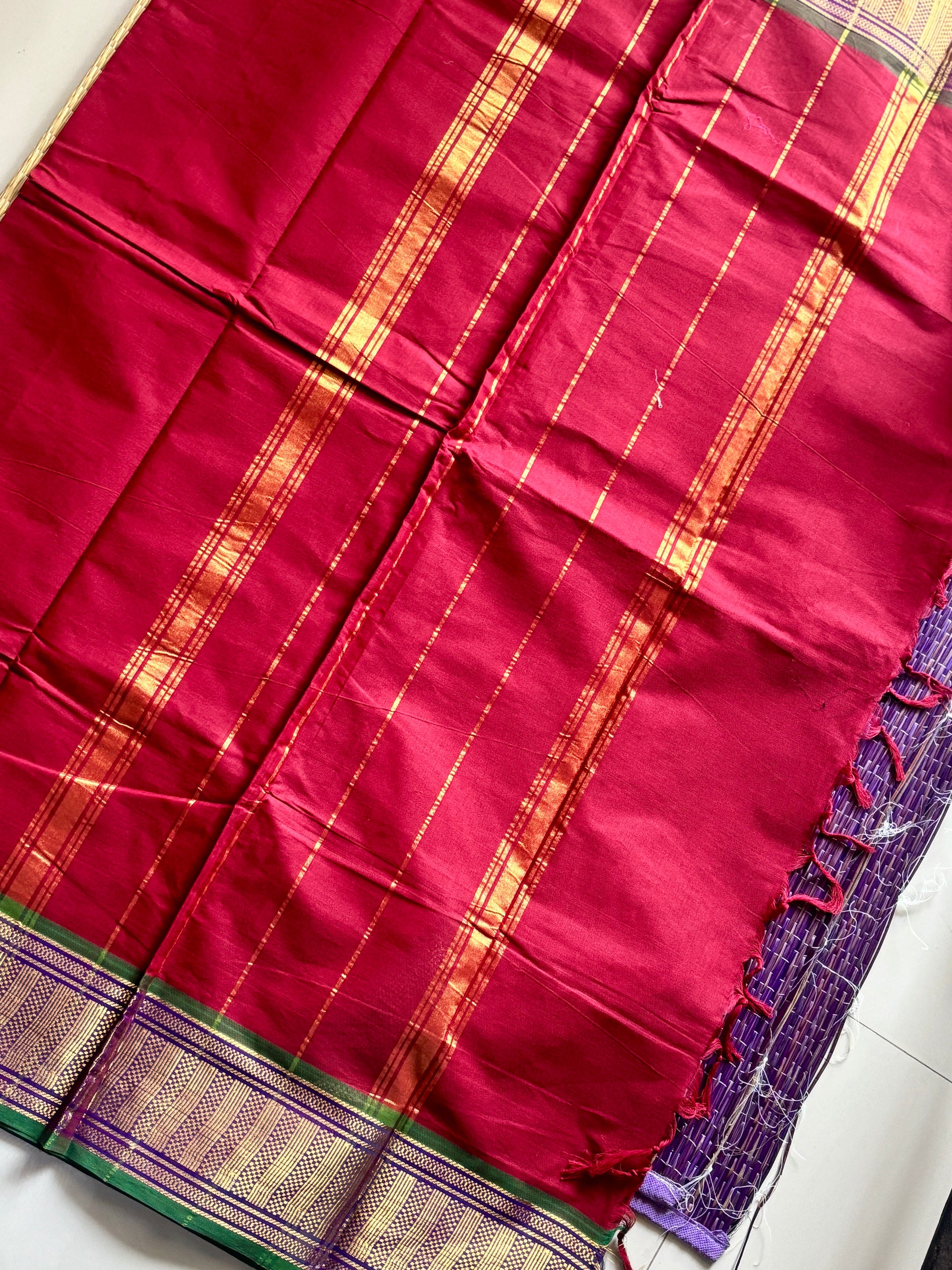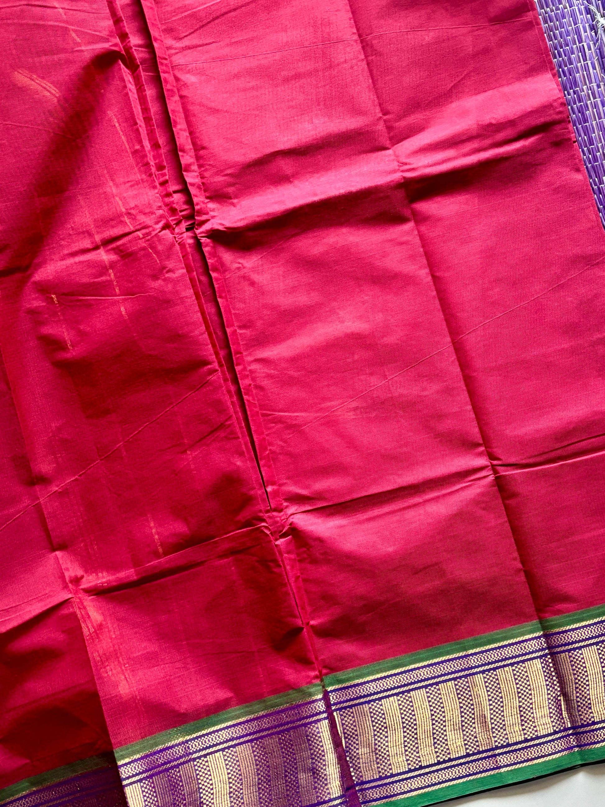 A graceful handwoven saree featuring a classic Maroon Red body.The border stands out in a vibrant green, adding a touch of tradition and elegance. Perfect for temple visits, festive occasions, or a cultural evening, this saree balances simplicity with richness.