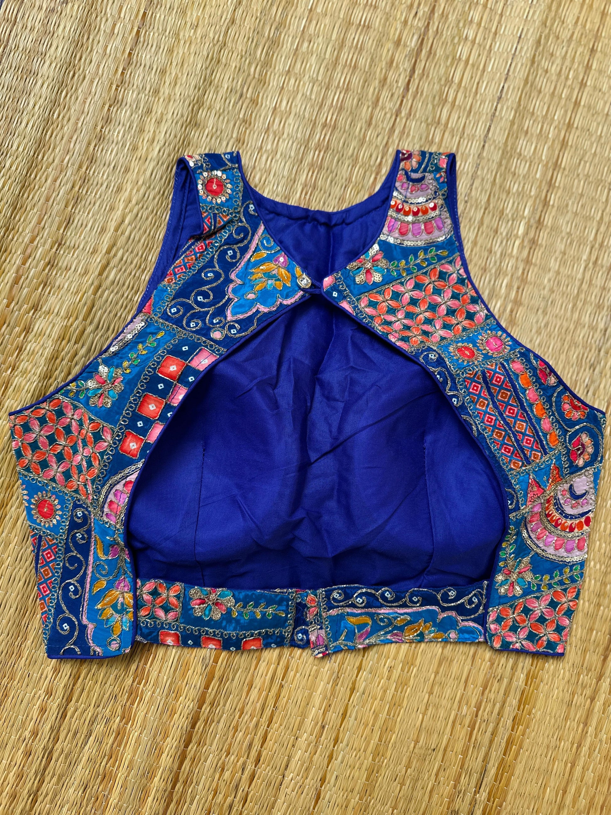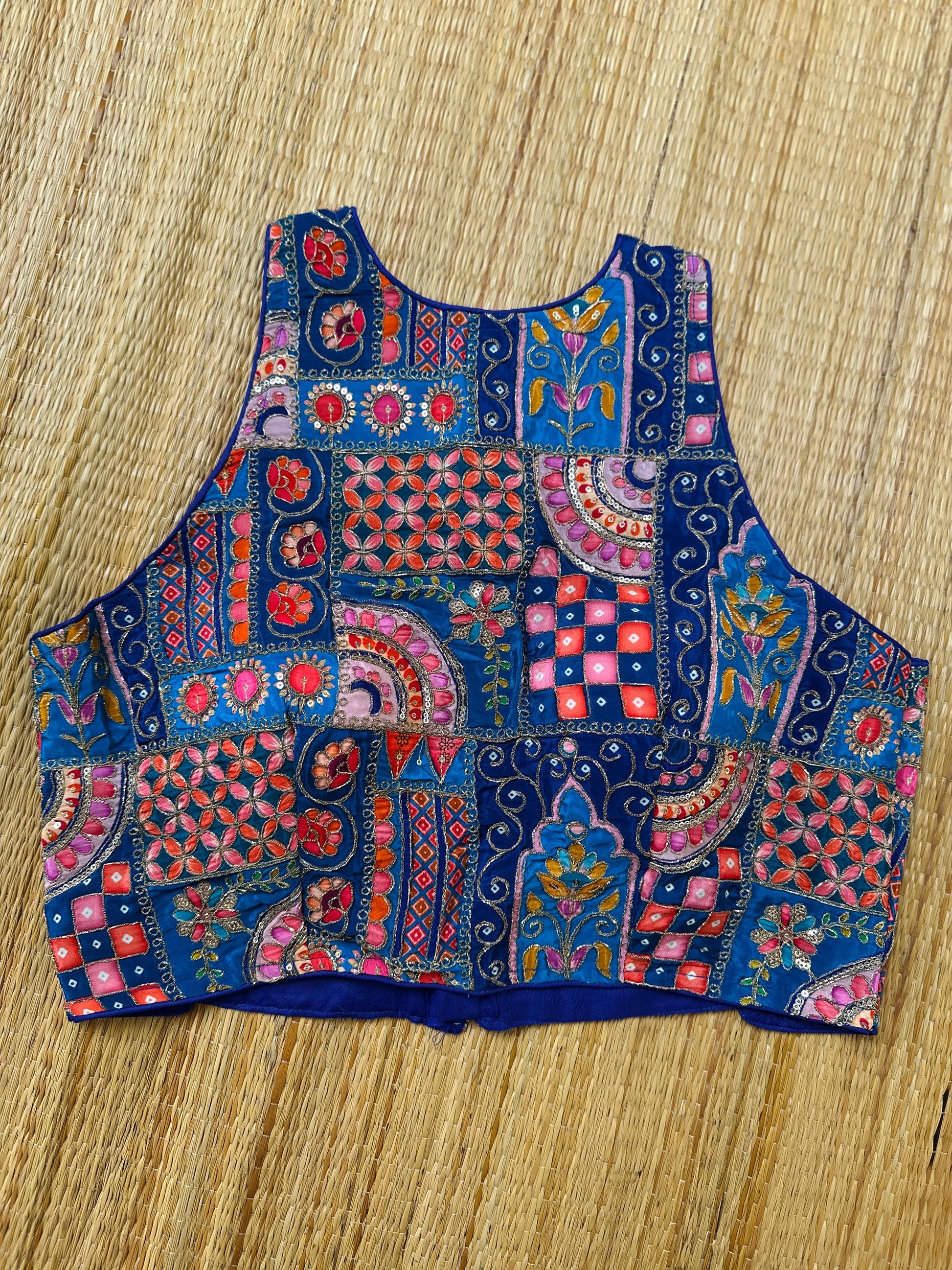 A vibrant patchwork model piece with intricate embroidery, this versatile design can be styled both as a blouse or crop top. Perfect for pairing with sarees, skirts, or even high-waist pants for a chic fusion look.ย